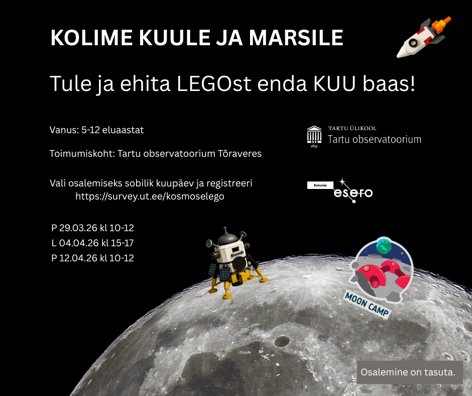 Töötuba ühendab loovuse ja teaduse – lapsed ehitavad oma tuleviku kosmosebaasi ning koos saame arutada, mida eluks Kuul või Marsil oleks vaja. Koos ehitamine innustab ja kohapeal on hulk LEGO klotse ka  kõige loovamate ideede jaoks.